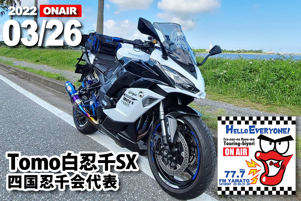 2022年03月26日土曜日20時放送のくらさんの今日もツーリング日和 「 Motorcycle friendship」バイクの輪ゲストは、前回の猫Photo Rider Sちゃんさんのご紹介で、四国白忍会代表 Tomo白忍千SX さんにご出演いただきます。