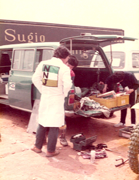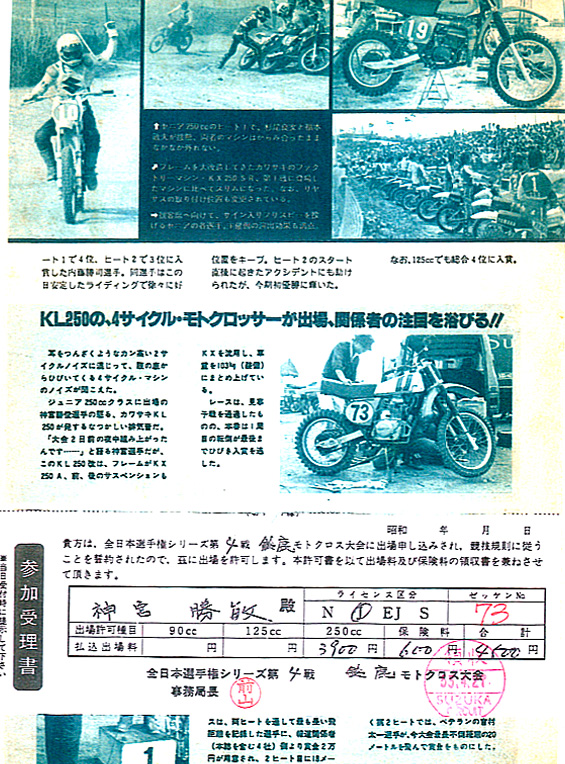 仕事の傍ら1980年4月、モトクロス ジュニアクラスに4サイクル車(カワサキKX250の2サイクルエンジンを外しKL250の4サイクルエンジン搭載)でエントリー 全日本出場車両が全て2サイクル勢の中、4サイクルマシンは自分のみ。2サイクルとはノイズの質が違うので、ギャラリーの視覚には入っていなくても、音でどこを走っているかがすぐに分かってしまう。独特の低音が、一緒に走っている人に言わせれば「後ろにあの音が聞こえたら、無茶苦茶 焦る!」。 鈴鹿大会のデビュー戦の時、自分のメカニックをしてくれていた友人に「大勢のお供の人を連れた人がニコニコして立っていて、どこかで見たことがあるなぁと思ったら、本田宗一郎さんだった!!!」と、後日聞かされた。 |
